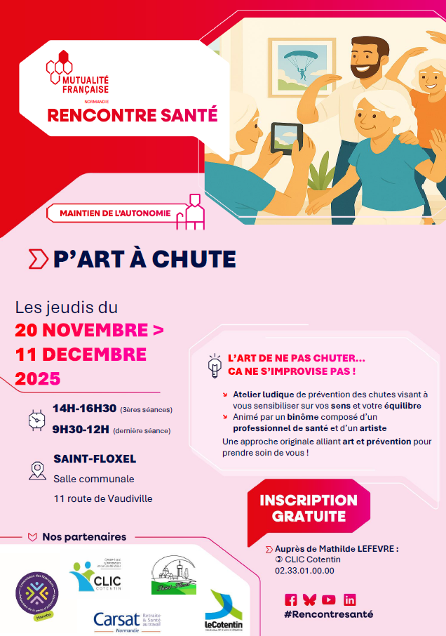 Le CLIC, la mutualité française Normandie et la commune de Saint-Floxel vous proposent un cycle de 4 séances de prévention des chutes destinés aux seniors de plus de 60 ans, via une approche culturelle et artistique.