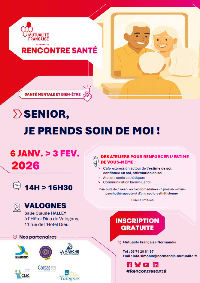 Le CLIC, la mutualité française Normandie et la commune de Valognes via son CCAS, vous proposent un cycle de 5 ateliers pour renforcer l’estime de soi pour des seniors de plus de 60 ans. L’objectif est de favoriser le bien-être des seniors tout en instaurant une dynamique conviviale et bienveillante.