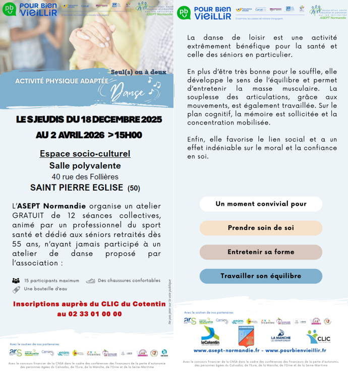 Le CLIC et l’ASEPT Normandie proposent un cycle de 12 séances de danse adaptée : en ligne, en solo, en duo, rythmée ou douce… Patricia ROBERT, animatrice, adaptera les séances selon les personnes inscrites et leurs capacités : douleurs articulaires, troubles de l’équilibre…